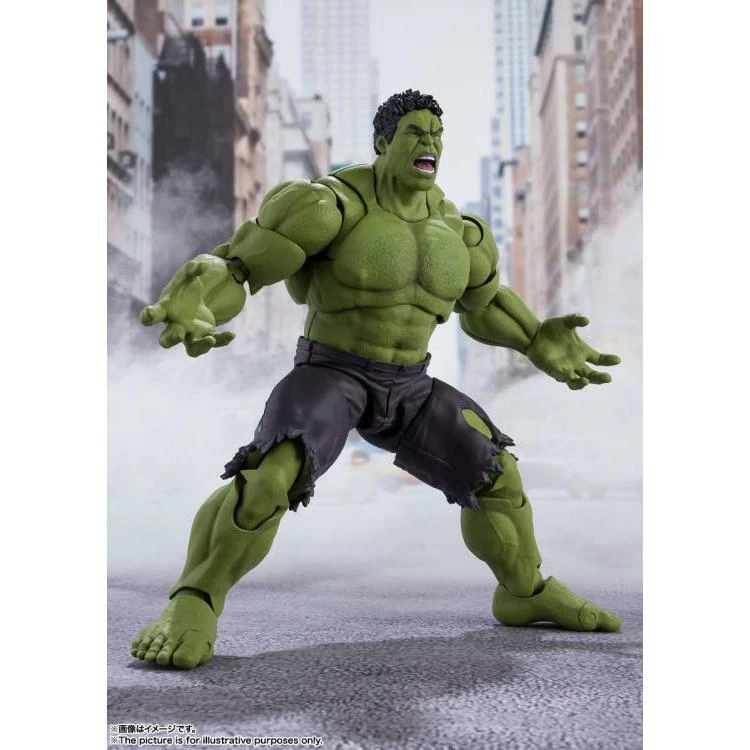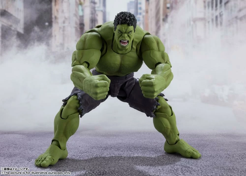 Hulk smash! The Incredible Hulk, as seen in the Avengers films, joins S.H.Figuarts with a completely new sculpt. Powerful musculature is captured with cutting-edge posing technology. Digital coloring faithfully captures his appearance and facial features. The Avengers assemble when you combine Hulk with the other heroes (sold separately)! Set Contents: Main body, Two optional heads, Two pairs of optional hands