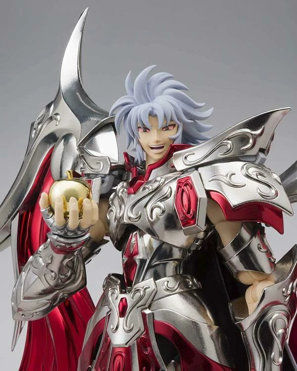 Ares, the fierce and relentless antagonist of the Gemini Saga, awakened as the God of War, joins the Saint Cloth Myth EX series! Portrayed in his gorgeous silver and crimson-chrome colors, this is one stunning figure. The set includes cloth armor set, three optional expression parts, optional hair part, four left and five right optional hands, sword, golden apple, and object mode frame.