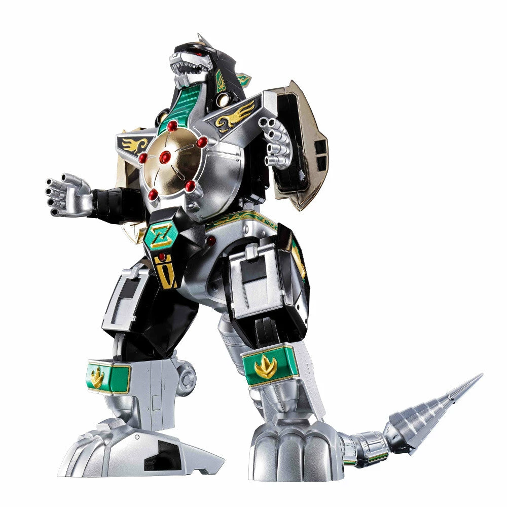 Long requested by fans, the Dragonzord joins the Soul of Chogokin series! Its three components pose, combine, and transform! Also combines with the GX-72 Dairyujin (sold separately) to create the Dragon Megazord battle mode! Also includes an original new feature, the ability to open the Dragon Antlers from the chest, for added realism and no unnecessary parts visible when combined with the GX-72 — a historic first! Also includes TV version Dragon Antlers. The set includes a tail base, tail tip, and two pairs of optional hands.