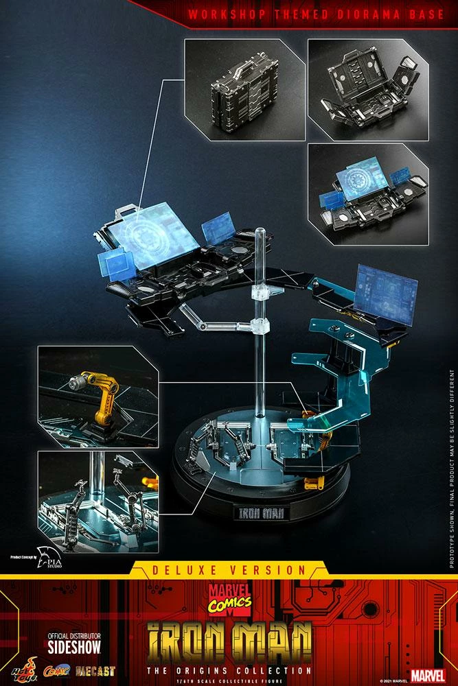 The deluxe version includes a signature Iron Man suitcase with articulated function, also an elaborated diorama figure base with LED light-up function, allowing fans to explore Tony Stark’s high-tech workshop straight from the comic pages, includes articulated gantry arms, extra armor parts, and holographic screen accessories.