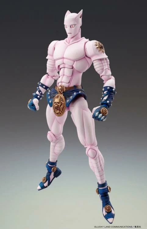 From Medicos. Now available in shaded pink, as envisioned by Hirohiko Araki, Killer Queen returns to Medicos’s Super Action Figure lineup! The lethal Stand is incredibly posable for all kinds of amazing action, and comes with seven interchangeable hands, as well as Stray Cat, which can fit inside a chamber in its midriff or be “planted” in the included pot! A stand with a posing arm and a sound effect sheet is also included.